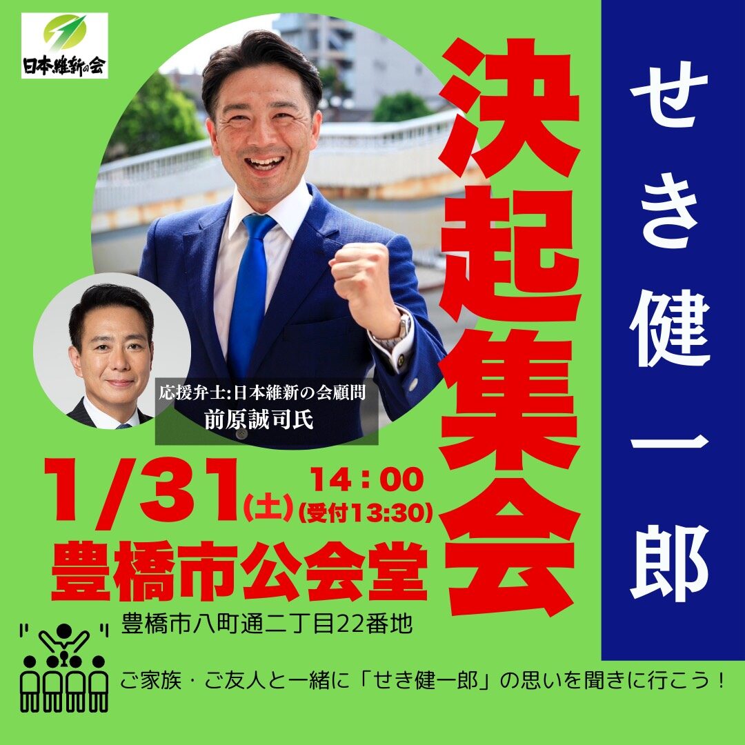 せき健一郎【決起集会】1/31(土)14時(受付:13時半)場所:豊橋市公会堂